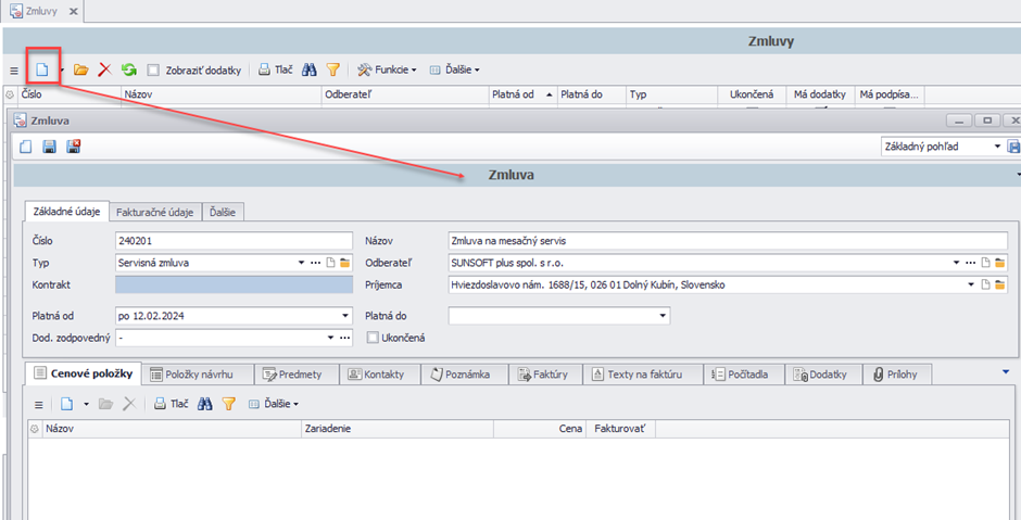 Zmluvy sa vytvárajú tak ako všetky doklady v systéme cez nový záznam.