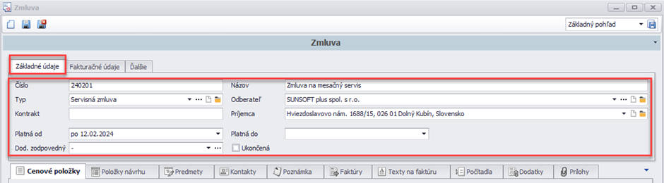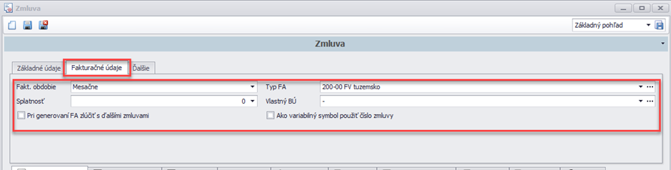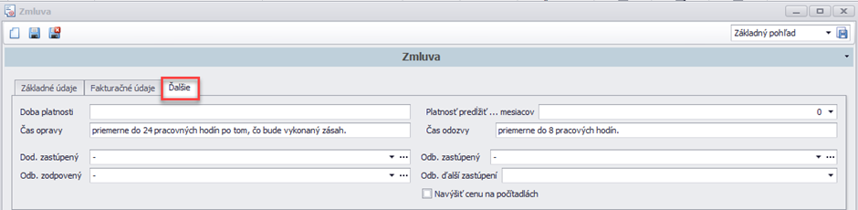 Na základných údajoch sa môže vybrať typ zmluvy, ktorý si môžete navoliť cez číselník typov.