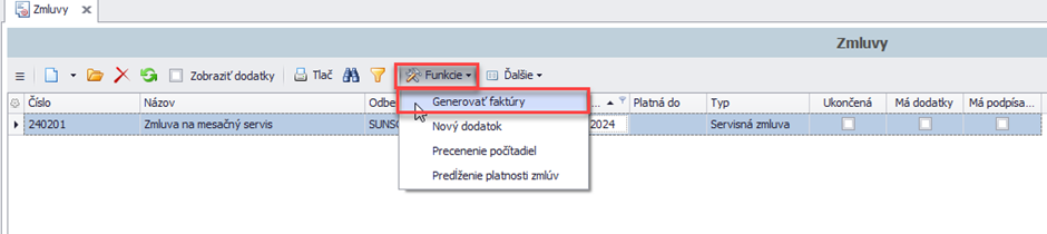 Na základe intervalu, ktorý je zadaný na zmluvy sa generujú faktúry vystavené, na konkrétny typ doklady, ktorý je zvolený.