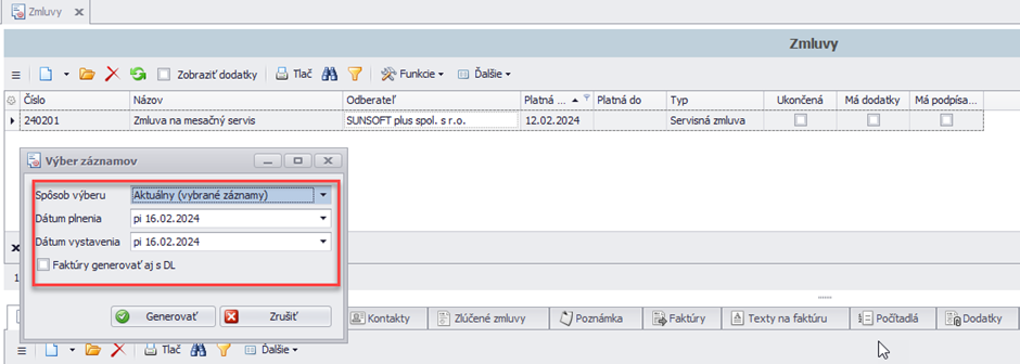 Pri generovaní sa zvolí spôsob výberu z ktorých zmlúv sa budú generovať doklady. Zadá sa dátum plnenia a dátum vystavenia poprípade či sa má alebo nemá vytvárať DL.
