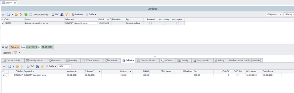 Po vygenerovaní faktúry sa zapíše faktúra do zoznamu dokladov v module OASIS a taktiež v zmluvách v záložke Faktúry.