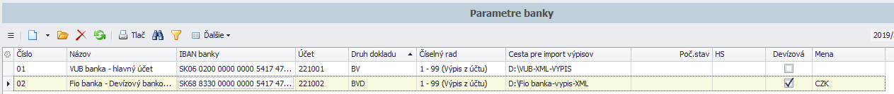 Parametre banky slúžia na evidenciu a nastavenie jednotlivých bankových účtov. Pred prvým použitím banky sa musí každý bankový účet, ktorý sa vo firme používa zaevidovať do parametrov banky. Každá banka bude mať svoj vlastný riadok.