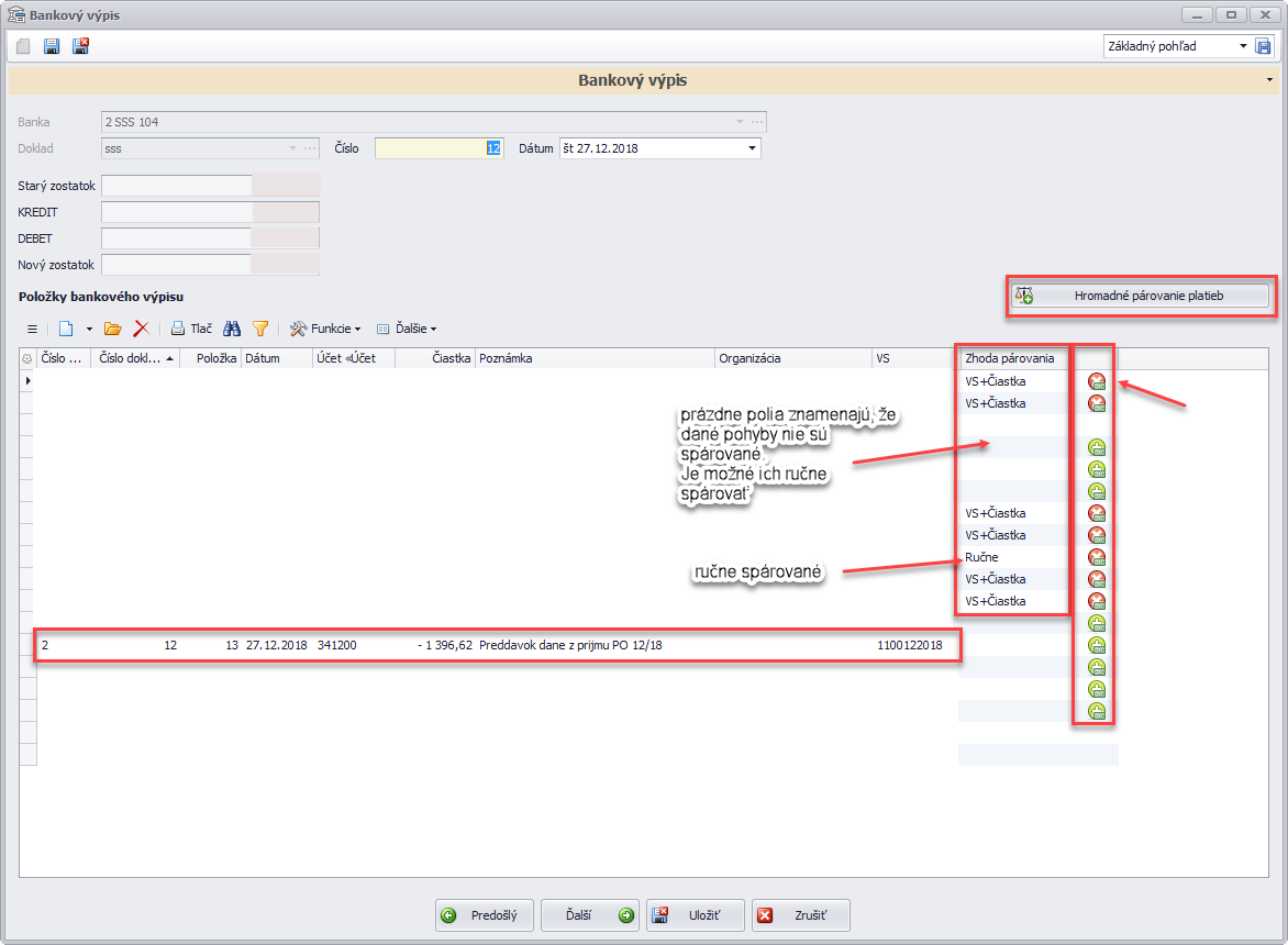 Po importe výpisu z HB sa natiahnu rôzne pohyby na účte. Je potrebné si zadať hromadné párovanie platieb.