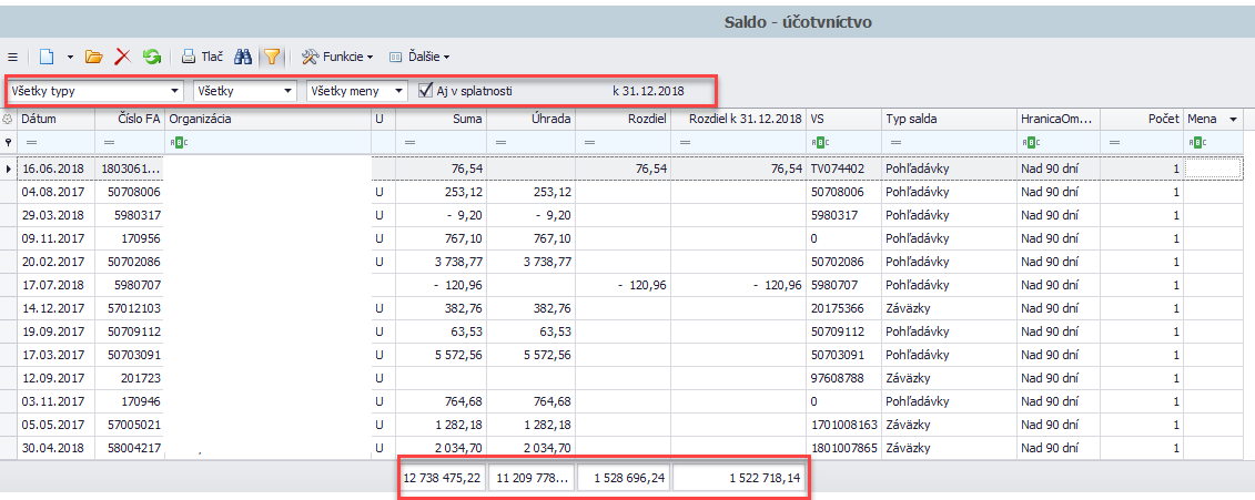 V stĺpci rozdiel je aktuálna hodnota salda na prihláseného používateľ a v stĺpci rozdiel k dátumu 31.12.2018 je suma k 31.12.2018 (tieto dve sumy sa nemusia rovnať).