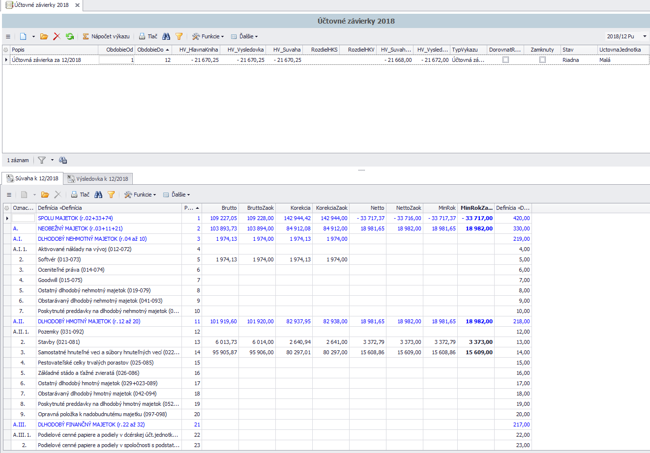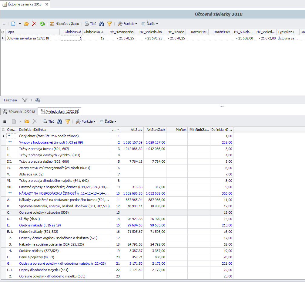 Po uložení nového výkazu sa výkaz napočíta. V spodnej časti sú záložky súvaha a výsledovka.